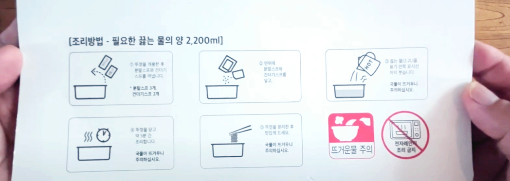 다만 덩치가 만만치 않은 녀석이라 작은 사발면도 뜨거운 물 사용을 주의해야 하는데 이 녀석의 물의 양은 2.2리터를 부어야 하는 것이라서 뜨거운 물 주의라는 표시가 더 눈에 들어왔습니다.