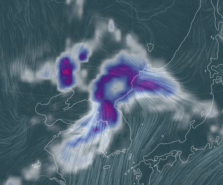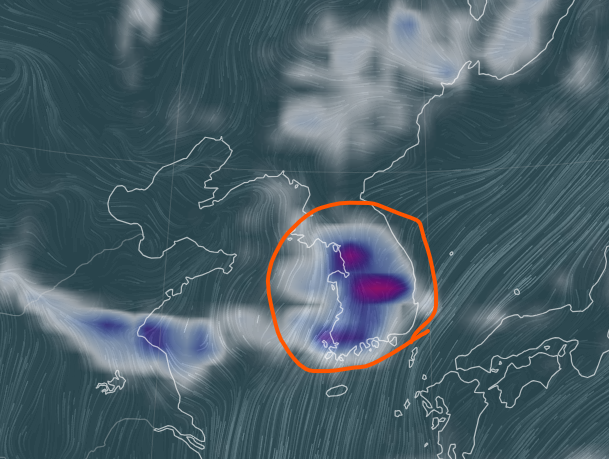 제가 출근할때는 그렇게 비가 많이 내리더니 이제는 거의 내리지 않아서, 앞으로 비가 얼마나 더 올 것인가 궁금해진 저는 최애 하는 기상 사이트 earth.nullschool.net 로 가서 확인해 보기로 했습니다.