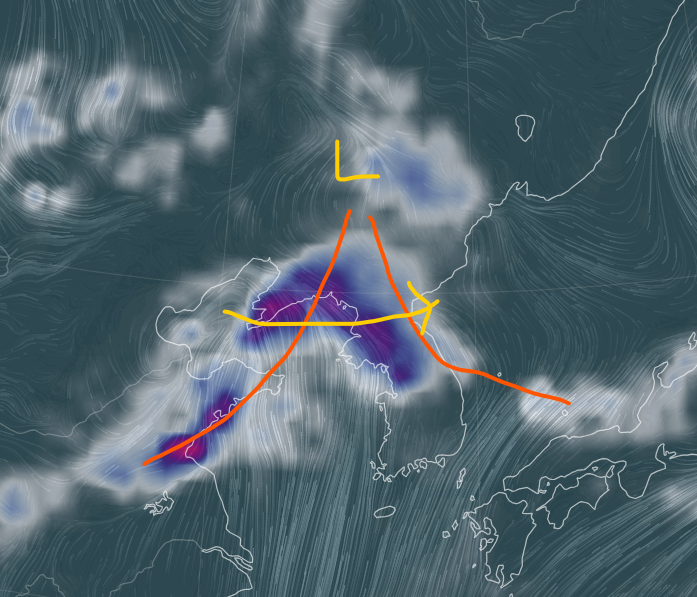기상청에서 말한 것처럼 한반도 위 북쪽에 자리한 저기압이 축이 되어서 왼쪽 사진의 노란 화살표처럼 계속적이고 반복적으로 비구름 전선이 만들어지고 빠르게 이동하고 빨간 선처럼 기합의 골이 깊다 보니 어쩔 수 없이 한반도를 세로로 덮는 전선이 만들어지며 그에 따라 비의 형태도 국지성 집중호우를 계속해서 보이고 있는 것이라 할 수 있습니다.