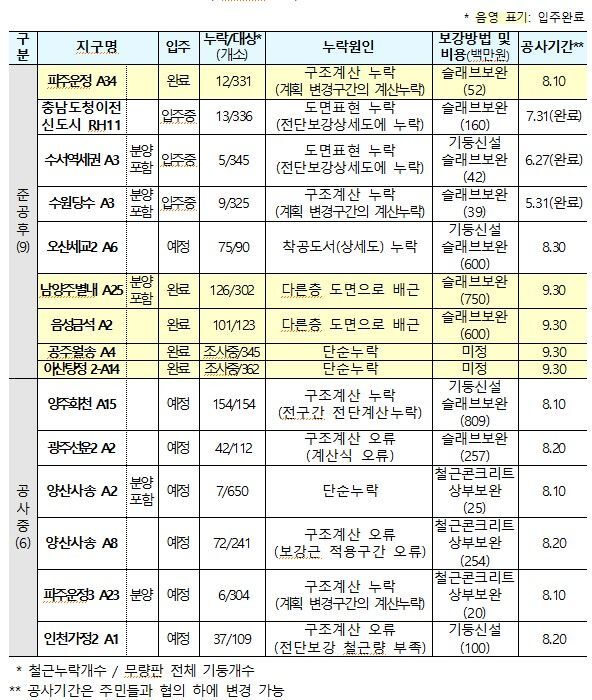 또한, 해당문제를 인지하고 보강을 진행하여 완료한 곳은 3곳 보강 진행중인 단지 3곳, 나머지는 9곳은 보강 예정이라고 밝혔습니다.