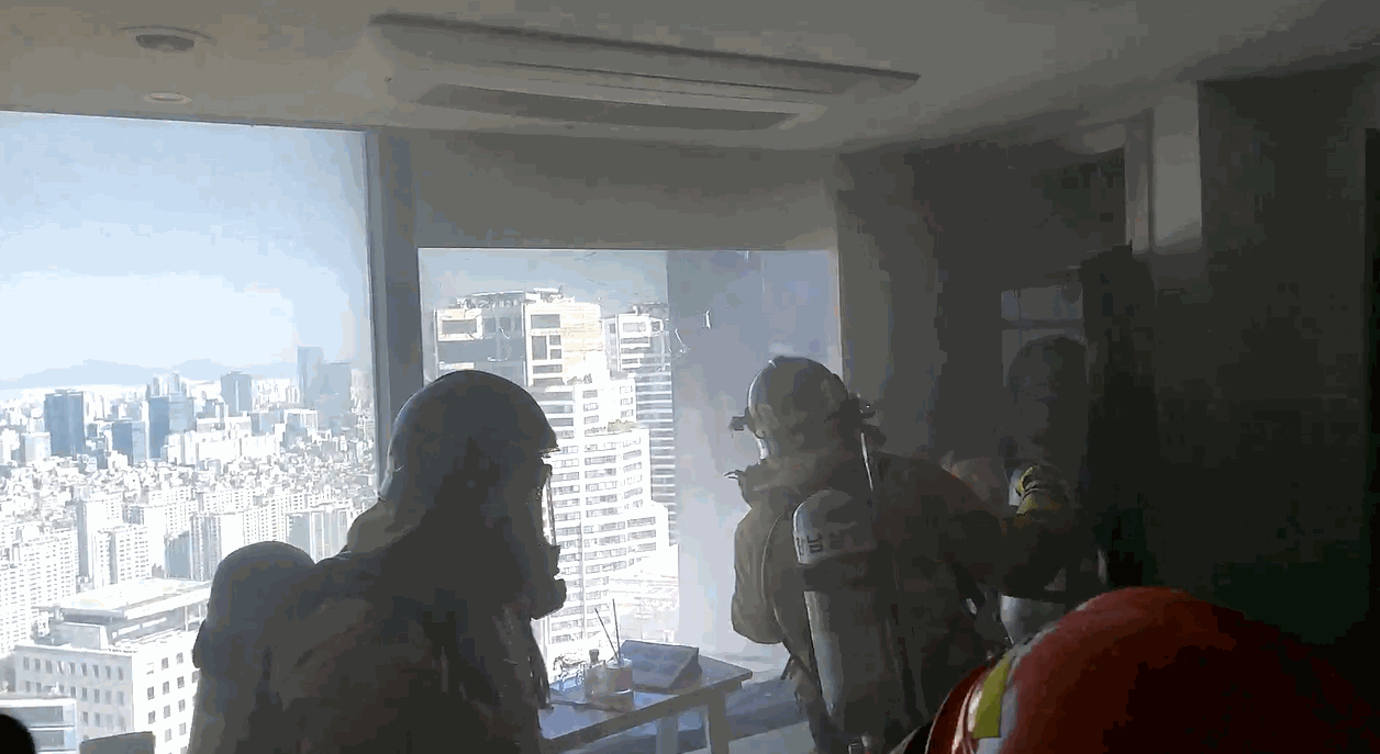 서울 강남구 도곡동 타워팰리스 53층에서 난 불을 끄는 영상이 공개됐다. 건물 내부에 진입한 소방관들이 외벽에 붙은 잔불을 끄면서 아찔함을 느끼는 지 고개를 돌리는 모습이 영상에 담겼다. 6
