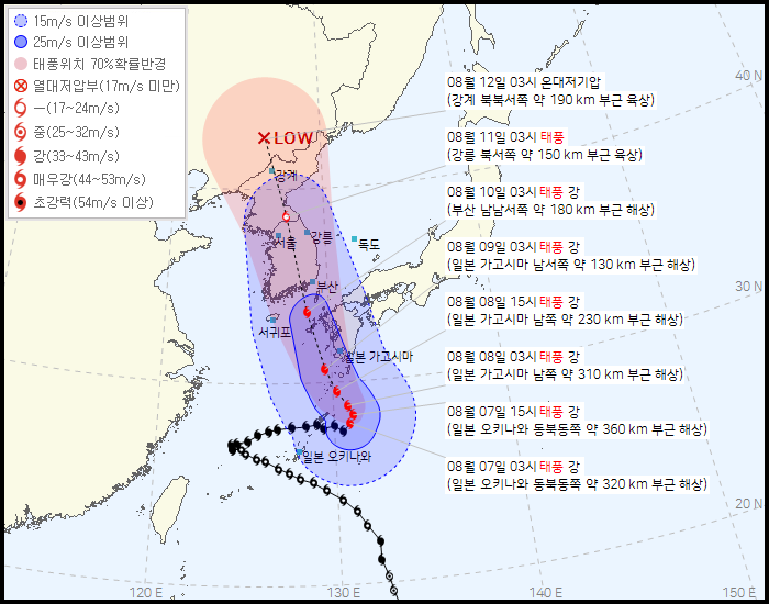 위 이미지를 보셔서 아시겠지만 카눈의 경로 예상은 제가 8월 1일에 올린 글에도 나와있었지만 이미 그때부터 한반도를 지나갈 것이라고 예상하고 있었습니다.