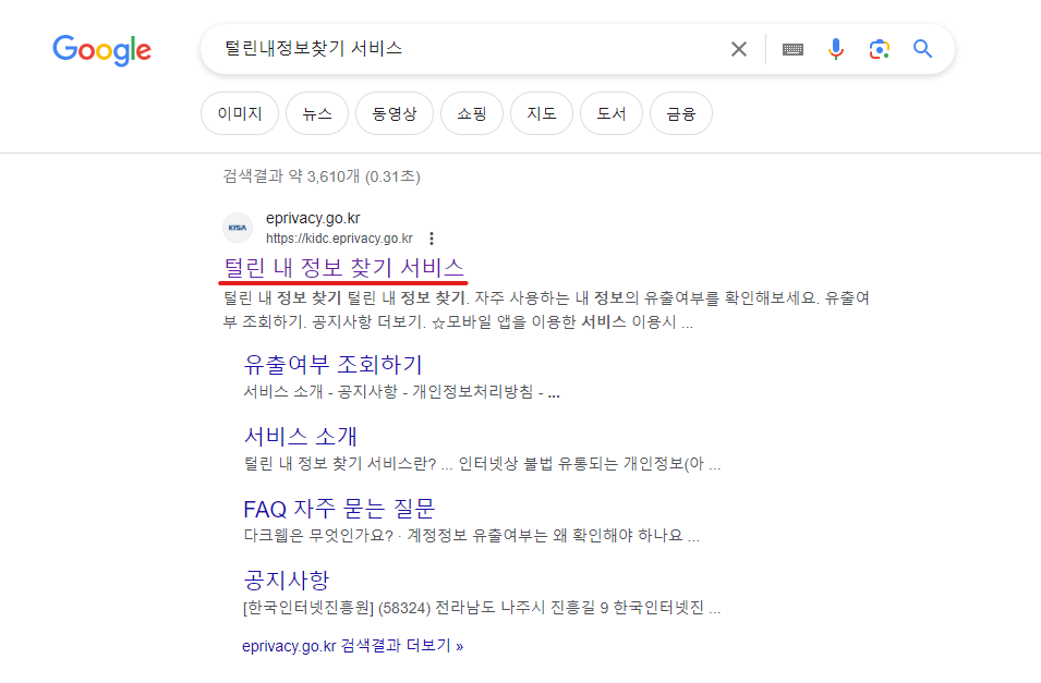 인터넷 창에 '털린내정보찾기'를 입력하고 검색을 하면 아래 이미지와 같이 '털린 내 정보 찾기 서비스'가 조회가 됩니다.