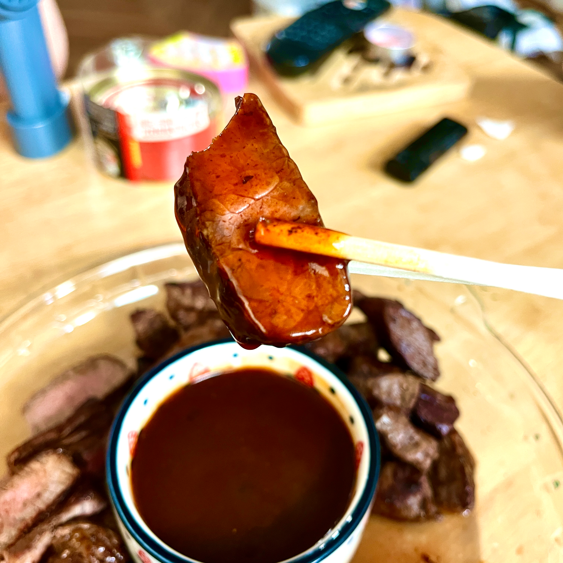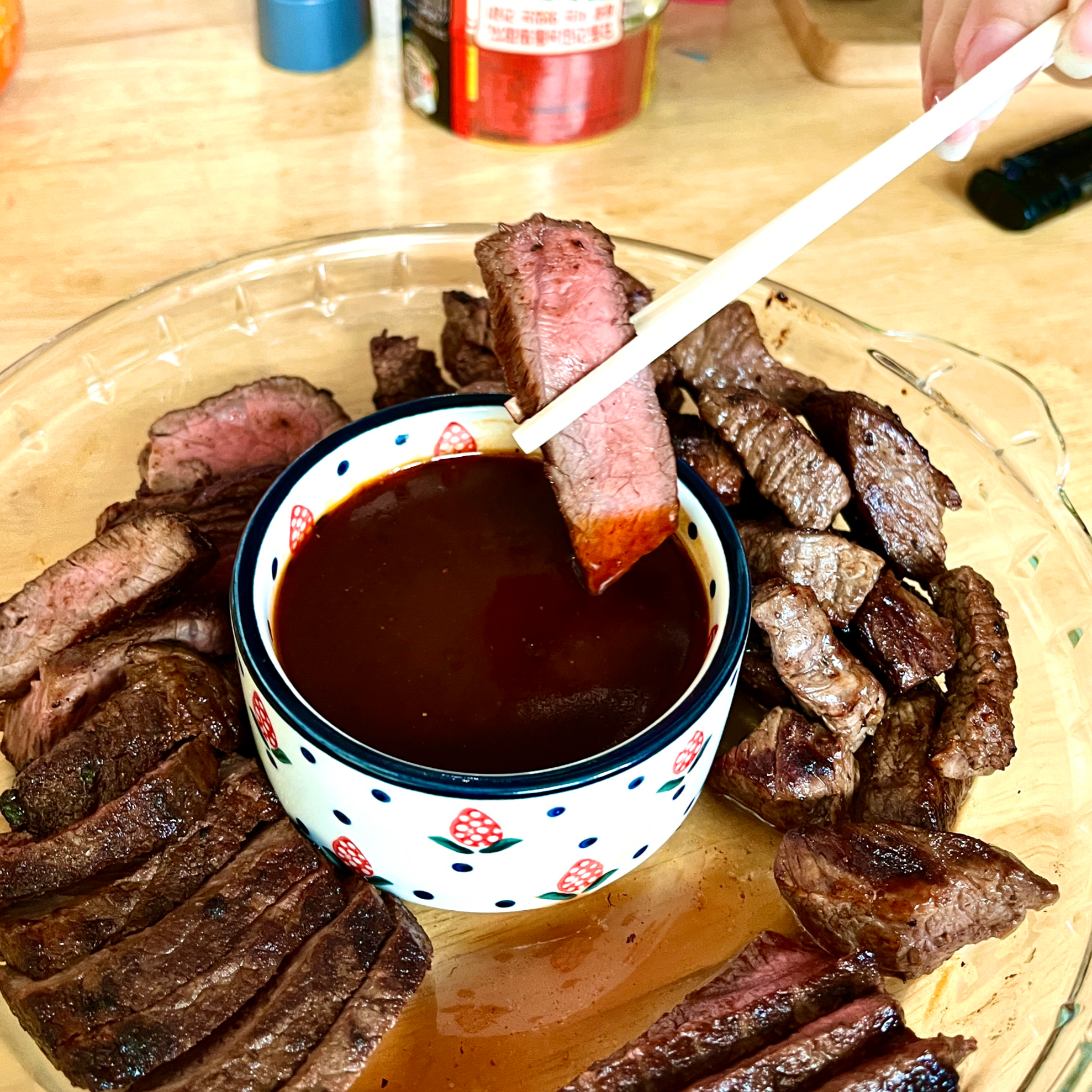 아 한 가지 더 스테이크를 오랜만에 버터도 넣고 해서 잘 구워봤는데요, 그 구운 기름에 돈카스소스와 케첩 그리고 물, 마지막으로 후춧가루 조금 넣어 조려 소스도 만들었습니다.