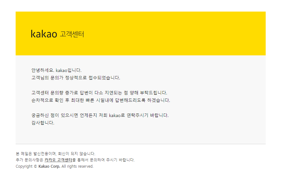 시스템에서 답변하는 상투적인 메일, 문의가 많아 순차적으로 답변하며 지연된다 라는 내용으로 말이죠 ㅠㅠ