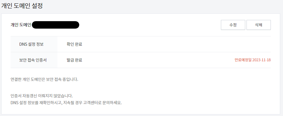 티스토리에 도메인 설정 중에 '보안 접속 인증서'라는 것이 있는데요, 이 것이 만료일을 가지고 있습니다.