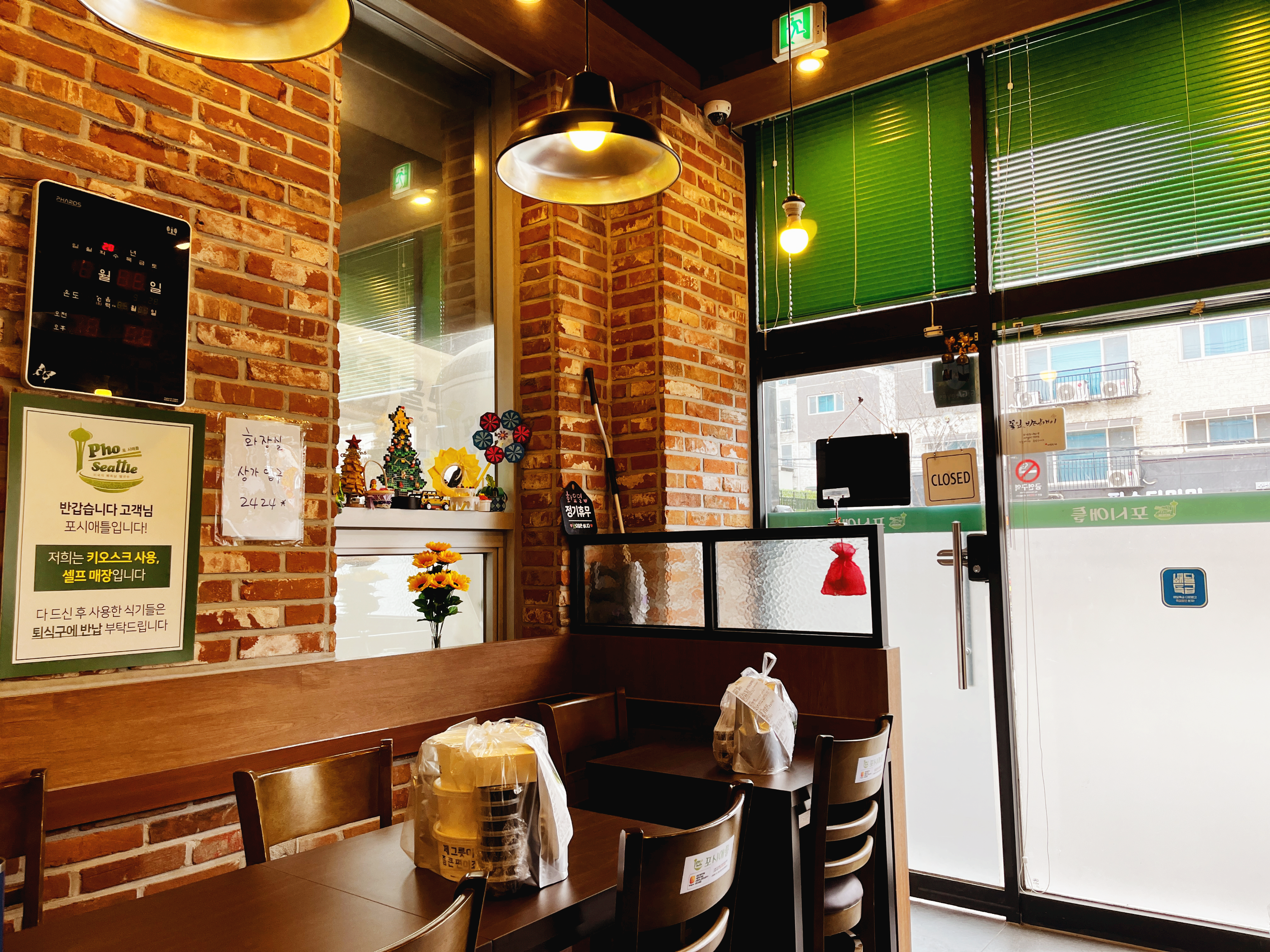 포시에 틀은 작은 매장으로 주문은 키오스크로 해야 하고, 물 및 쌀국수에 필요한 고수, 양파절임 등은 셀프로 직접 챙겨야 합니다.
