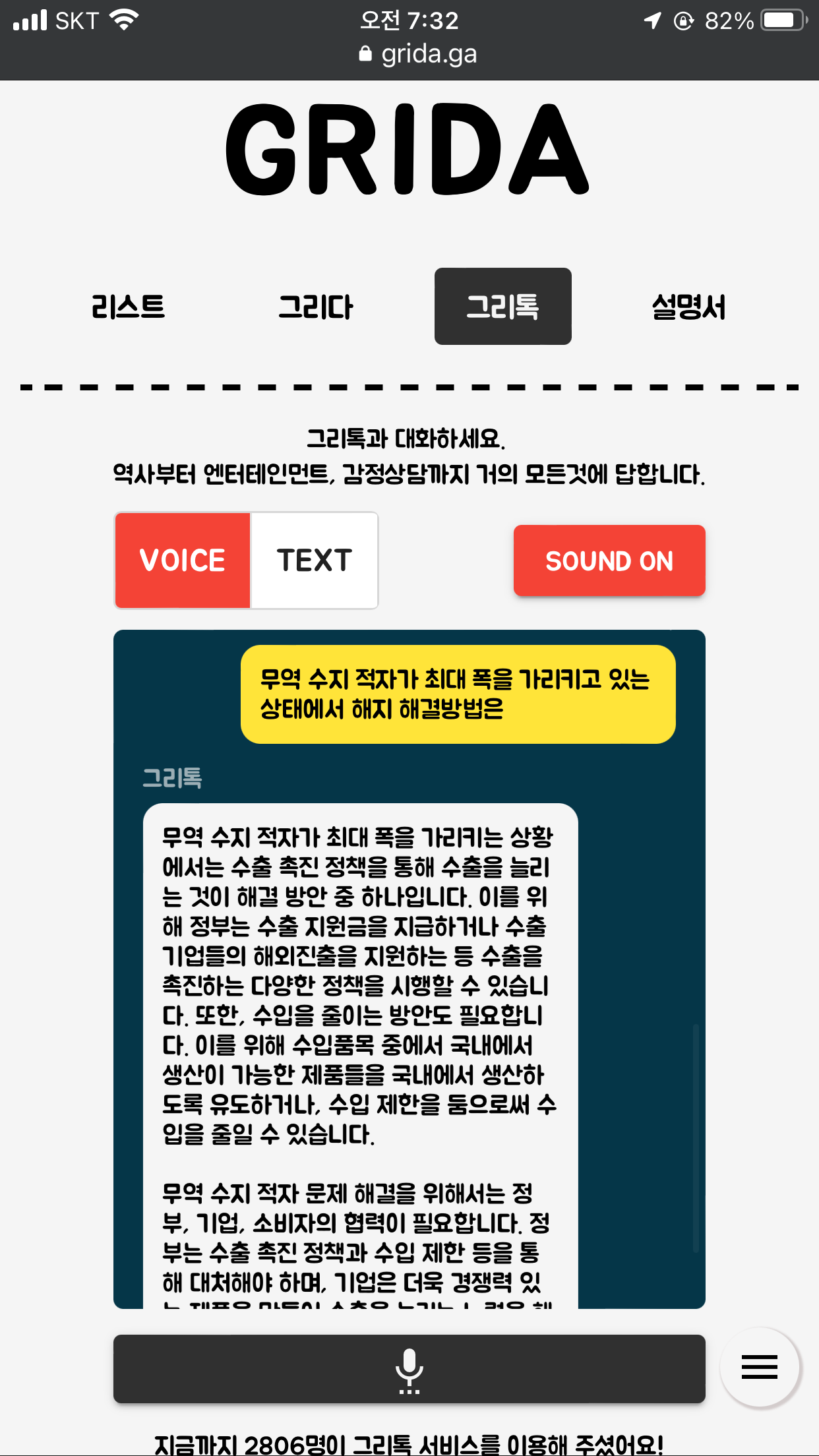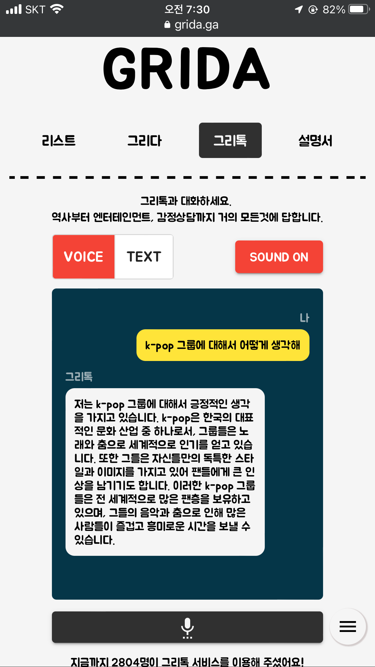 요즘 ChatGPT가 정말 핫하잖아요? 저도 ChatGPT를 몇 번 사용하고 관련된 글을 적기도 했었는데요 이 그리톡도 ChatGPT처럼 물어보면 챗봇 자신의 지식을 토대로 대답을 해 줍니다.