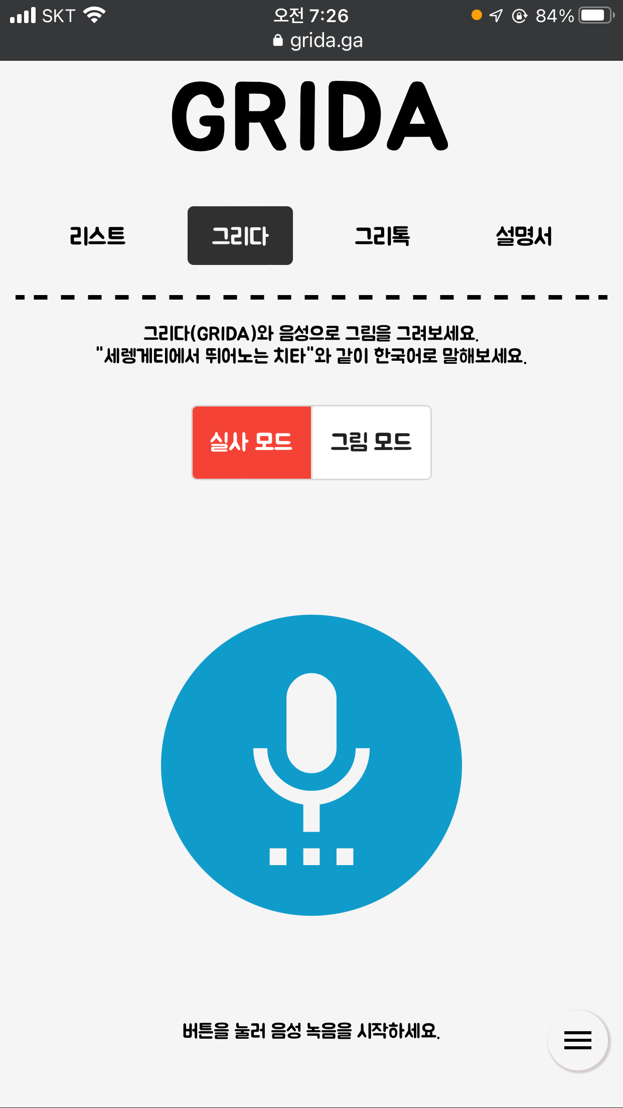 그 화면 가운데 파란색 마이크 버튼을 눌러 브라우저에서 마이크 권한을 허용하고 다시 실행하여 그리고 싶은 그림을 설명하는 말을 문장으로 말하면 됩니다.