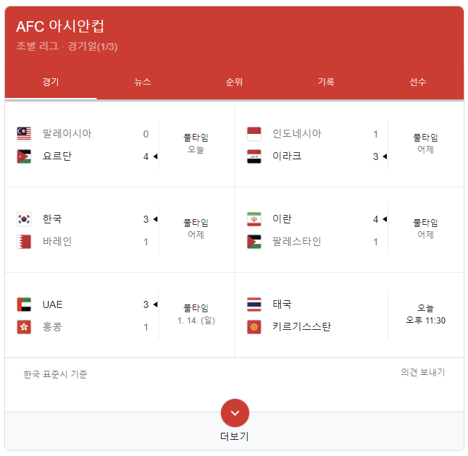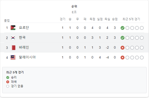 우리 나라가 속해 있는 E조에는 요르단, 바레인, 말레이시아가 있는데요 요르단이 말레이시아를 4:0으로 이기면서 조 1위를 유지하고 있고 3:1로 승리한 한국이 조 2위를 유지하고 있습니다.