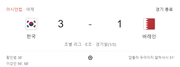 아시안컵 한국의 첫 경기 바레인과의 경기에서 3:1로 승리를 하였습니다.