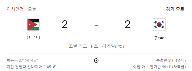 암튼 어렵게 2:2로 무승부를 하면서 1승 1 무로 순위변동 없이 1위 요르단, 2위 한국으로 마지막 경기로 토너먼트 진출 팀이 결정될 것 같습니다.