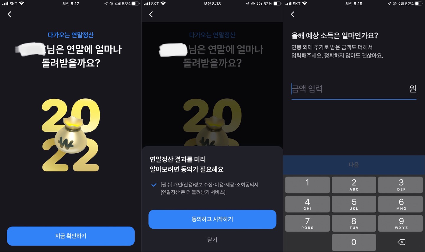이외 다른 핀테크 앱에서도 찾아보시면 연말정산 미리 보기 기능을 사용하실 수 있을 것 같습니다.