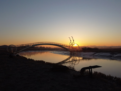 시흥시 월곶동에 위치한 자전거다리는 독특한 일출 배경을 제공합니다.