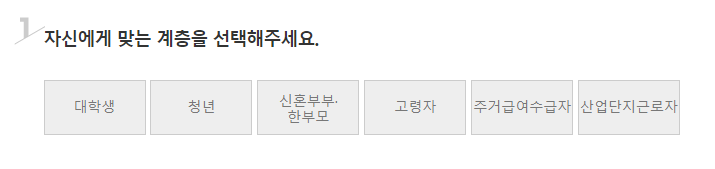 - 미혼인 무주택자로 19~39세에 속하거나 소득이 있는 업무 5년 이내인 사람 또는 퇴직 후 1년 이내의 자 중 구직급여 수급 자격이 있는 자 또는 예술인