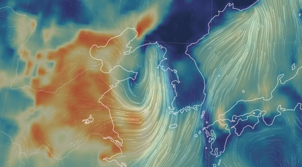위 사진을 보시면 종다리의 영향으로 서해에 큰 바람벽이 쳐져 있어 중국의 미세먼지가 전혀 들어오지 못했었습니다.
