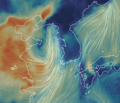 위 움짤을 보시니 어떠세요? 바람의 벽은 하루 만에 허물어졌고 내일 오전 7시 정도 되니 그냥 바람이 중국에서 동해로 나가는 형태로 바뀌고 중국의 그 많은 미세먼지를 그대로 끌고 들어오는 상황이 되어버립니다.
