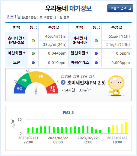 위 이미지는 에어코리아 홈페이지 메인 홈에 '우리 동네 대기정보'라는 이름으로 대기질의 정보를 표시하고 있는데 측정소 검색이라는 기능으로 자신의 집 주소를 검색하면 가장 가까운 측정소에서 측정한 정보를 표시하여 무언가 시민들과 소통을 하고 있는 기관이구나 하는 생각이 들게 만들어 줍니다.