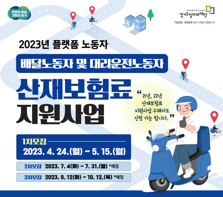 경기도일자리재단에서 2023년 플랫폼 노동자의 산재보험료 지원사업에 참여할 사업주를 모집하고 있습니다.