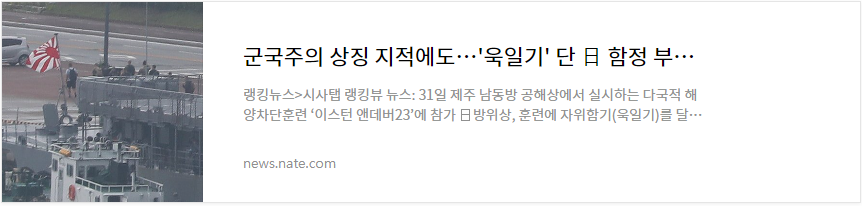 정말 짜증 나는 것은 국제법에 따라 훈련에 참가할 때는 각 나라 국기를 달고 참여해야 하는데, 일본은 자위대법을 말하면서 욱일기과 자국 기를 함께 달도록 규정하고 있다고 합니다.