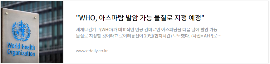 로이터 통신은 WHO 산하기관 국제암연구소(IARC)의 연구 결과를 바탕으로 아스파탐이 "인간에게 발암 가능성이 있는 물질"로 지정될 것이라고 전했습니다.