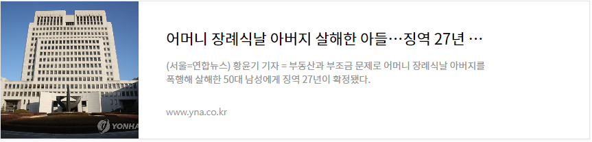 이 기사의 짧은 내용으로 이 아들 A씨가 얼마나 자신의 상황이 어려웠는지는 모르겠지만, 힘없는 아버지를 폭행했다는 것 하나만 보더라도 얼마나 인간 같지 않은지 알 수 있는 항목이며, 부조금이 적은 것과 아버지와 뭔 관계가 있다고 ㅠㅠ 결국 이 아들 A 씨는 그냥 돈이면 다인 속물에 지나지 않다는 것을 알 수 있습니다.