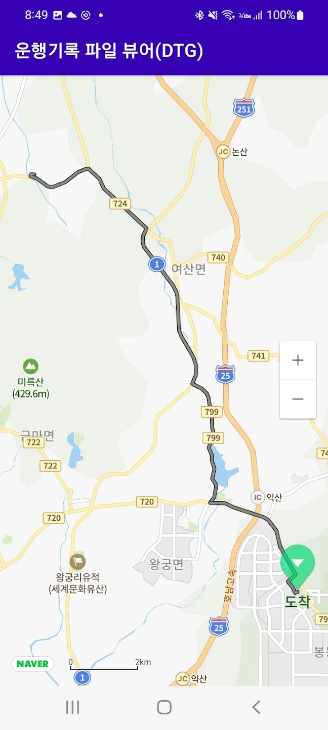옆에 화면은 위에서 설명드린 것처럼 분석된 운행 파일의 위치정보만을 필터링하여 실제 어떻게 이동을 했는지 확인할 수 있게 지도로 표시 한 화면입니다.