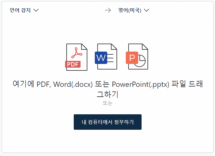 또한, 홈페이지 왼쪽 상단을 보면 지원하는 언어는 31가지이며, 번역할 문서파일(PDF, DOCX, PPTX)을 업로드 시 번역 후 새로운 파일로 받는 기능도 제공하고 있습니다.