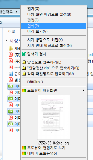 그렇게 해서 찾아보니 여러 가지 방법이 있었는데 그중에서 첫 번째 검색되었던 방법은 스캔한 여러 장의 이미지를 한 번에 선택해서 오른쪽 마우스 클릭 시 나오는 인쇄 기능을 실행해서 프린터 종류를 PDF로 선택하면 한 장의 파일로 합칠 수 있습니다.