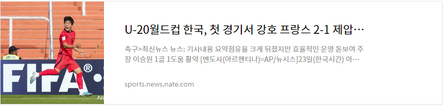 20세 이하 대한민국 축구 대표팀이 아르헨티나 U-20 월드컵 첫 경기에서 유럽의 전통 강호 프랑스를 2대 1로 물리쳤다는 소식입니다.