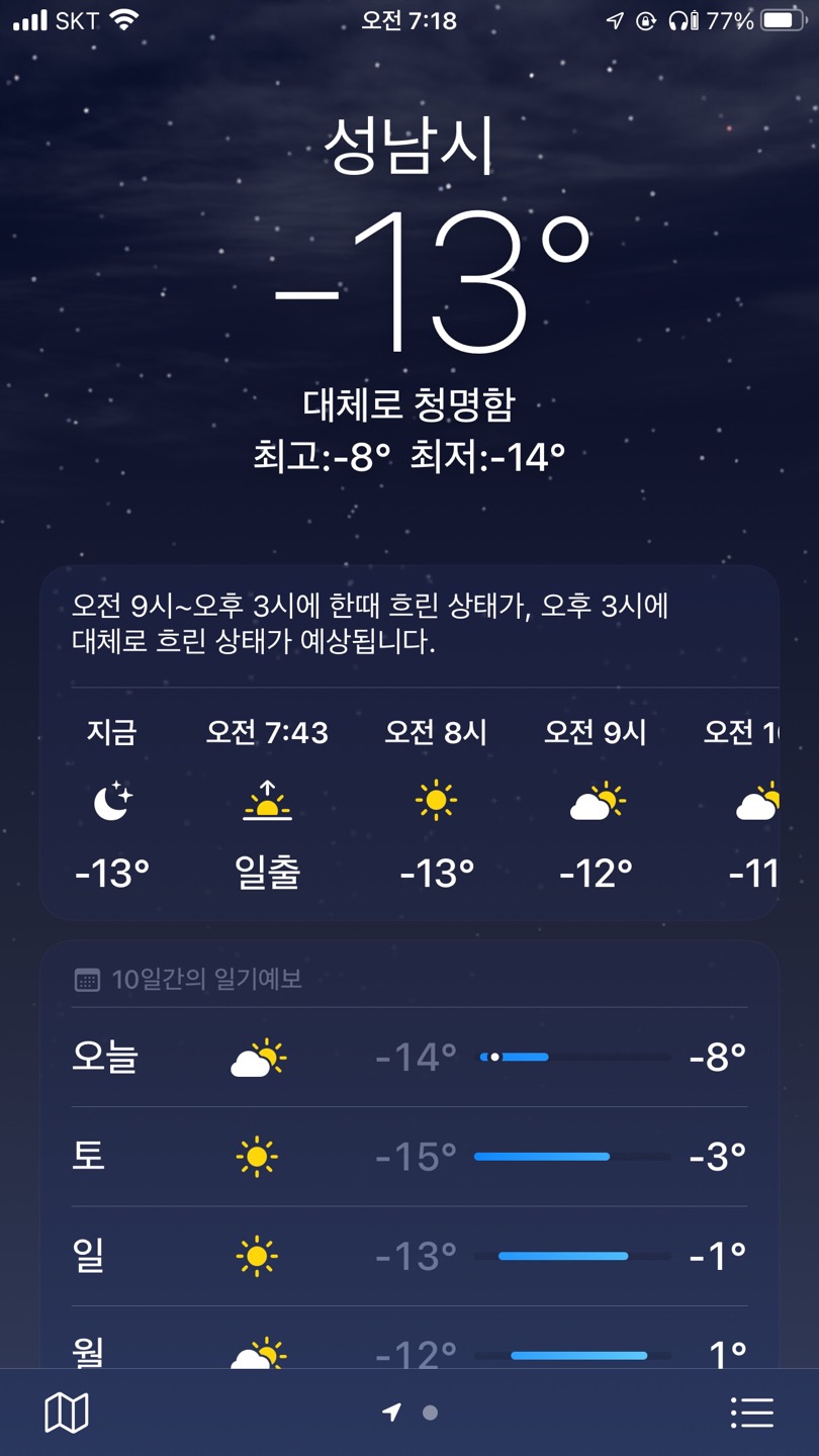 폰에서 안내 하는 오늘의 기온은 어제 알려준 기온과는 조금 다르게 낮 기온이 1도 올라간 수준인 -8 ºC로 나왔지만 그래도 체감 기온이라는 것이 있어서 더 추울 것이라는 것이 예상됩니다.